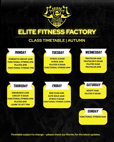 Sign UpOur diverse class timetable at Elite Fitness Factory is designed to cater to all fitness levels and interests. With over 30 classes running every week, you can find everything from high-energy boxing and HYROX training to more mindful practices like Pilates and yoga. Led by our team of experienced coaches, each class is crafted to challenge you, keep you engaged, and help you achieve your fitness goals. Whether you're looking to build strength, improve flexibility, or just have fun, our comprehensive timetable offers something for everyone, seven days a week.